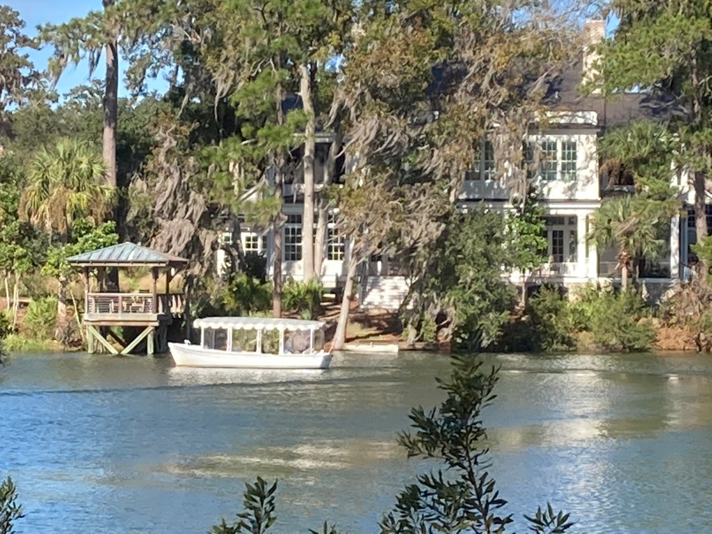 Once we got below Georgetown, we entered a whole new ecosystem – the low country. We were twisting and turning our way down rivers and creeks, surrounded on both sides by low marshes. No other boats except dozens of small open skiffs with outboards. Coming the other way after a morning hunt. The boat, the motor and the occupants all camouflaged.