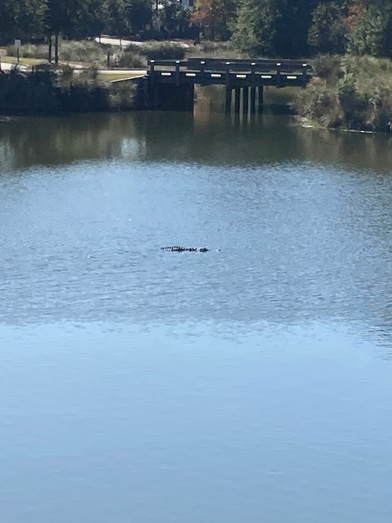 We are sitting on the screened porch on a warm, sunny day, watching the alligator. And some fish jumping. There’s not a cloud in the sky, there’s a soft, warm breeze, and Jeff bought me a dozen Perdomo cigars. Heaven.
