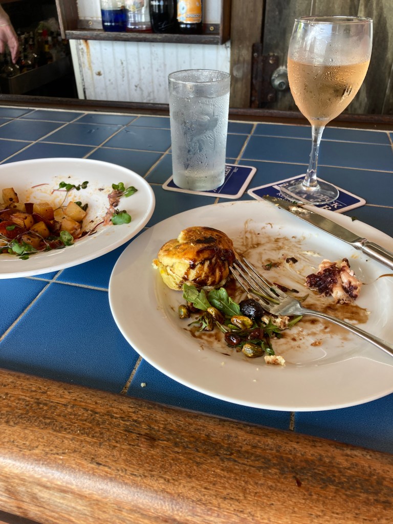 Grilled octopus, gorgonzola profiteroles, and a bottle of Provencale Rose’.