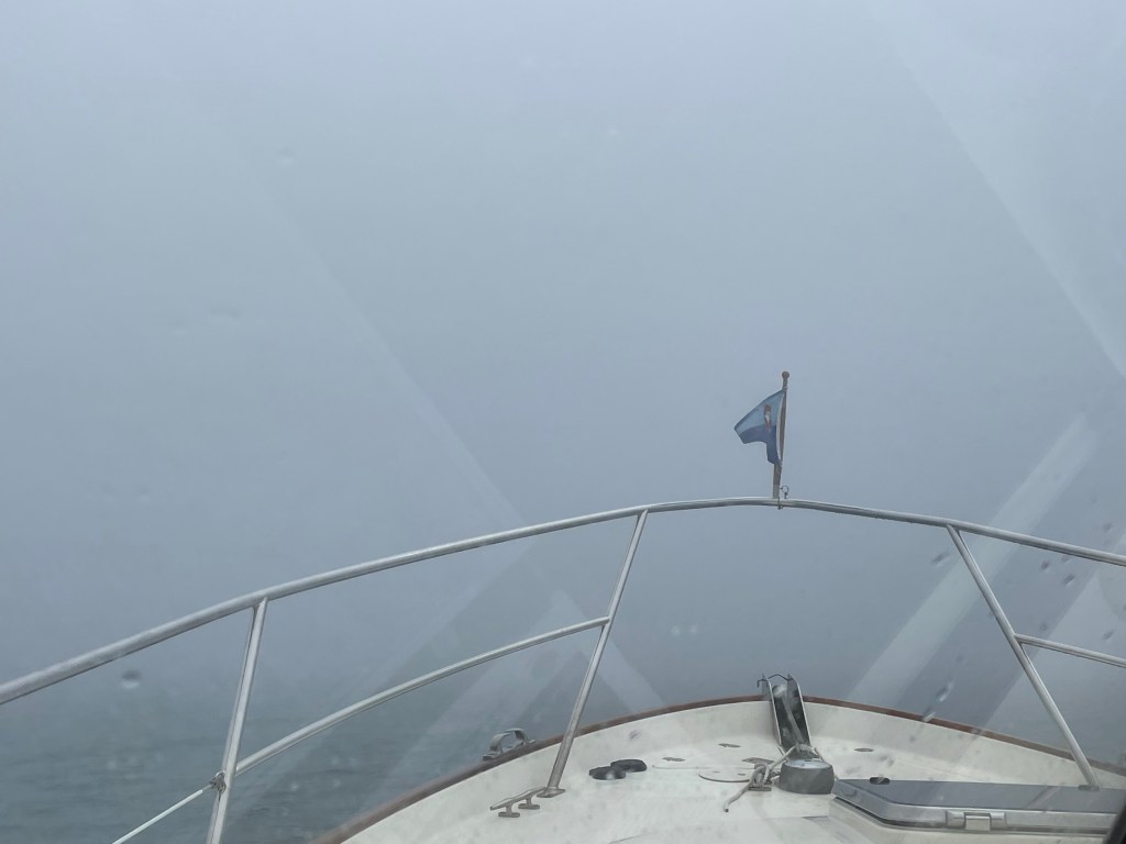 Another sloppy day at sea. 15-knot winds and 2.5’ swells. On our beam. We made a course change about halfway through the trip, choosing to run up Buzzard’s Bay instead of continuing into Vineyard Sound. That put us in the lee of the Elizabeth Islands, and the swells diminished appreciably. But then, we became enveloped in fog. Thank goodness for Radar.