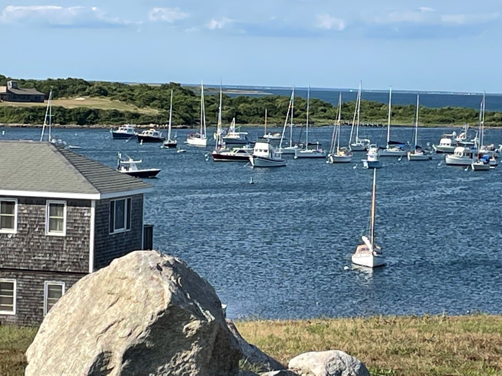 Today, we are two weeks into our trip, and we find ourselves in Cuttyhunk Harbor.  Cuttyhunk is the last and smallest of the Elizabeth Islands, an archipelago that trails southward from the “triceps” of Cape Cod.  The harbor is an oblong-shaped “pond” surrounded by land on all sides except for a narrow entrance channel.