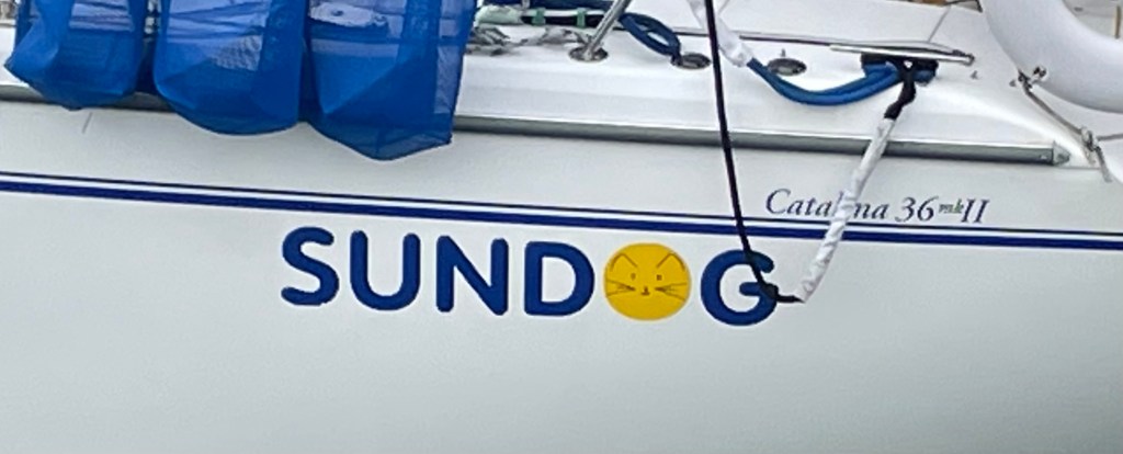 Some of our regular readers may remember us trying to find funny boat names. We passed this one earlier on the trip and thought it was strange to have a cat’s face in the name Sundog. They were tied up next to us last night and guess what – they have a cat on board! Next time Lynn’s cat, Kaly might join us.