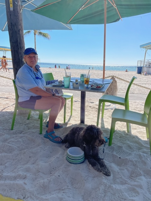 OK, now for some good stuff: we got back to the dog park, where I met all my old friends from 2020: Tucker, Shelby and the others. They moved the dog park in Key West, and the new location is right next to a small military post, and every morning they play the National Anthem at 8AM. Rod – because he’s a showboat – likes to sing along, and Duffy seemed to like it, because she jumped up into his chair!