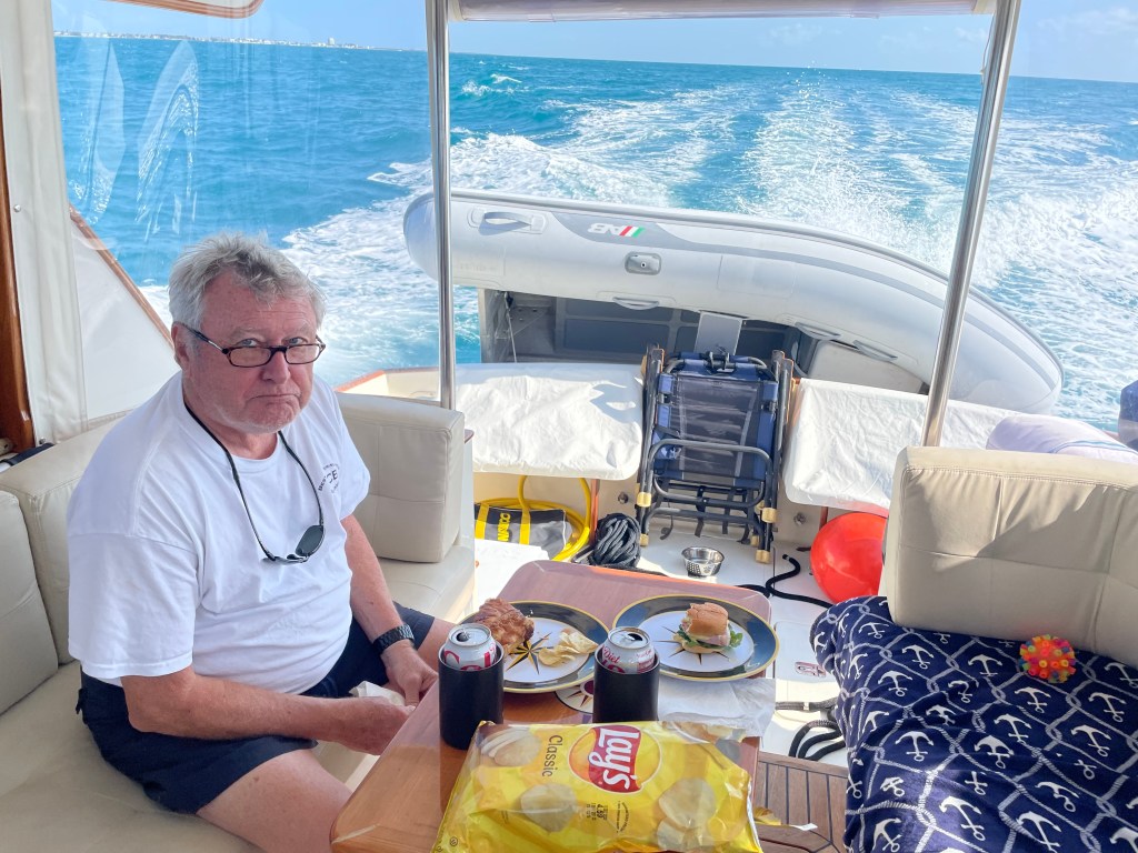 This morning, we took off early for Marathon Key under cloudy skies, but the trip down was very pleasant.  I finished a Michael Connelly novel as we travelled on Autopilot. And we had lunch underway – autonomous piloting!