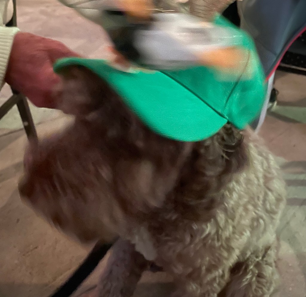 Then, as it was getting dark, everyone got really excited and ordered beer and food. Thee were special foods for today – nachos, pizza, ribs (love them bones), chicken wings. It smelled so good and I went from table to table pleading for treats so I had to be put on a leash.