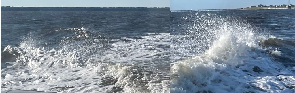 We were about to leave the next morning when Rod checked the bilge and the containers were full of water AGAIN! Something was leaking! He assumed it was a hose and, for some strange reason, had purchased a roll of special tape that sticks wet or dry. He was able to repair the hose with the sticky tape. After some pumping out, a few swear words, and some work, we headed off carefully to Charleston. Luck has been with us…had he not purchased the tape, he couldn’t have repaired this. And since it was a calm day, we were planning to go “outside” which means we would have been in the ocean with the leak.
