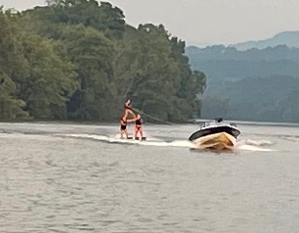 But first, let’s look back to last evening:  We had already posted our blog from Amsterdam Riverlink, when we learned it was Practice Night for Thursday’s Ski Show!  Very cool.  Two tow boats, maybe a dozen skiers.  Here’s a great shot of them doing a pyramid.