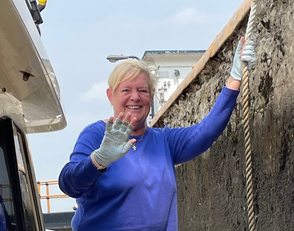 We traversed 7 more locks today.  Here’s a great shot of Lynn The Lock Queen: dirty gloves and all.  As we enter the lock, she grasps one of the long vertical cables and holds the boat steady as the waters surge into the lock vessel.  I use the engines and thrusters to hold her in position.  The lines and cable are slimy – hence, the gloves.