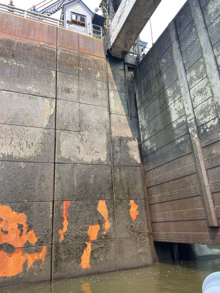 Lock #17 is the biggest lock we will encounter on The Erie Canal.  Its vertical lift is 40.5 feet.  It is difficult for the camera to show the scale of this lock.  It LOOMS overhead.   As you pull in, the depth beneath the keel is 14.5’.  When you leave, it’s 55’.  Imagine filling a vessel that is 235’ x 45’ wide x 40’ deep.  How much water would that take?  And the boats simply float up as the lock vessel fills.