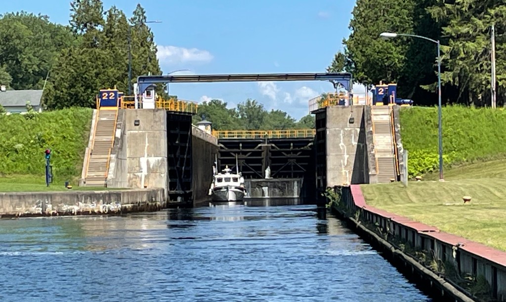 Tonight we are tied up at the foot of Lock 22 near the end of our portion of the Erie Canal and it is spectacular. Here’s a view of the lock with our friend’s boat exiting. (We were invited for cocktails once they tied up).