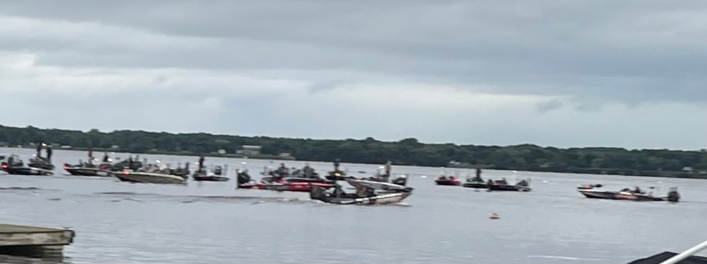 The process is amazing: it begins with all the boats lined up in a predetermined random order.  They parade past an official with their live wells open for inspection (they must leave empty, of course). Then, as their name is called over the PA system, they blast off for the far reaches of the lake.  Over 400 square miles of lake in which to fish; just be back by 3PM!