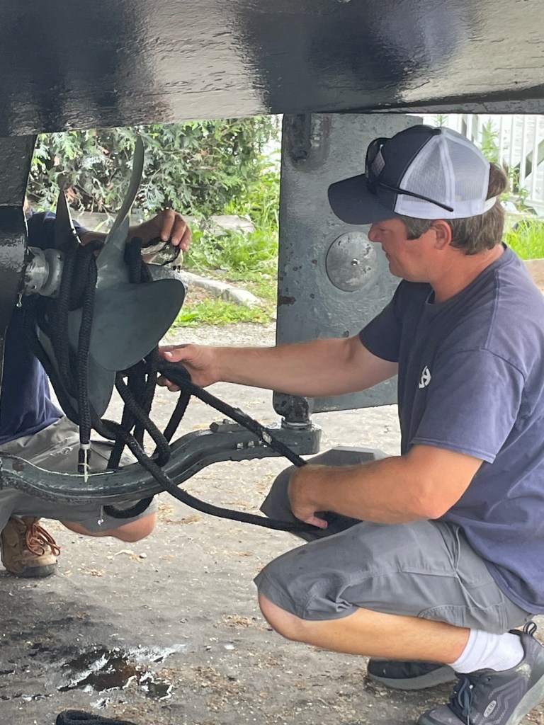 AND THEN, it turns out we had “sucked up” an old dock line that had been lying at the bottom of the slip. It was wrapped around and around the prop and shaft.