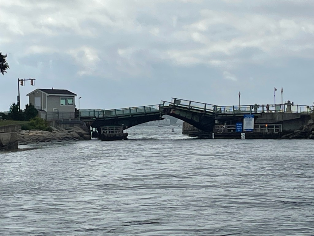 Thursday morning, we headed for Portland, Maine…our first Maine port of call. To reach Portland, you must travel around or through Cape Ann. We chose to go through it – via the Blynman Canal. You enter the canal at Gloucester Harbor, via a tiny drawbridge that opens on command. It’s only wide enough for a single boat to pass!