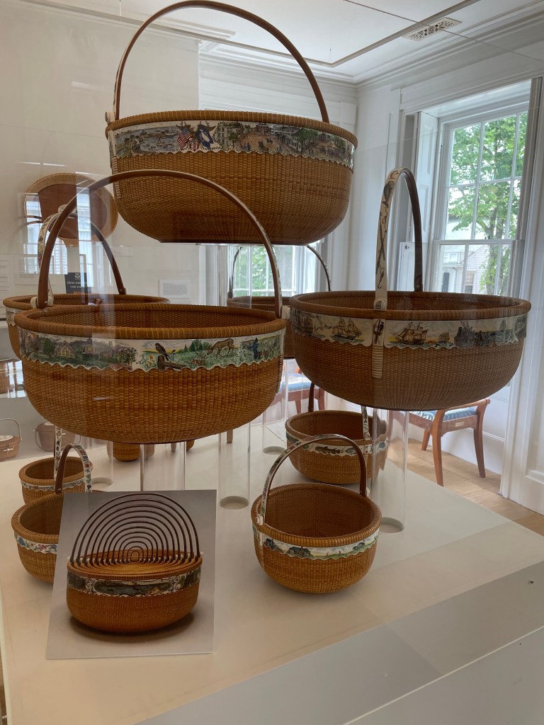 We visited the Hadwen House, where there was a beautiful display of Nantucket baskets including a demonstration by one of the docents who also makes baskets. He took his time giving us a complete tutorial on making these baskets and all the work involved. Look at the nesting baskets below designed with scrimshaw – each depicting a different theme relating to Nantucket.