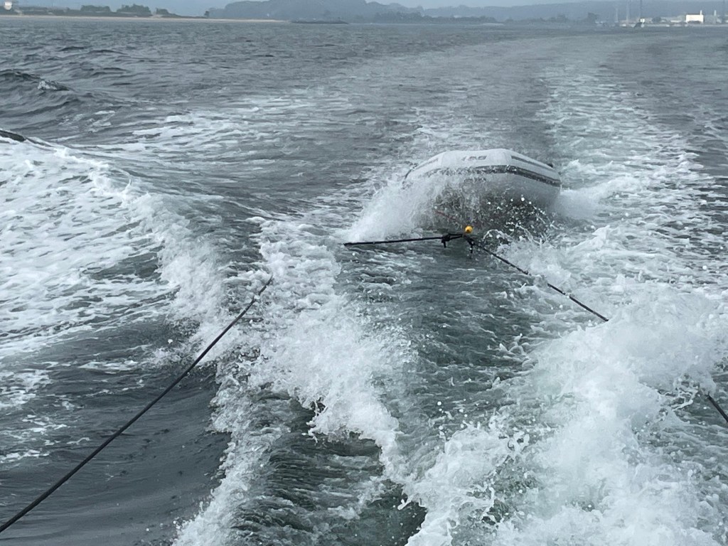 The dinghy glue was still curing, so we had to rig a bridle and tow it. Here’s a great shot Lynn took as it followed us at the end of two 50ft. lines: